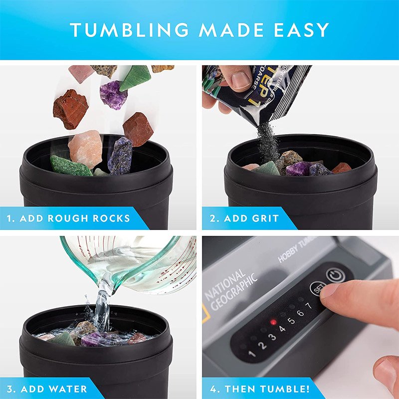 Turn rough rocks into polished gems: Discover and learn fun rock tumbling with Advanced Rock Tumbler. Pour in the rough stones and grit and let the machine do its job!