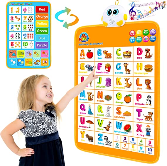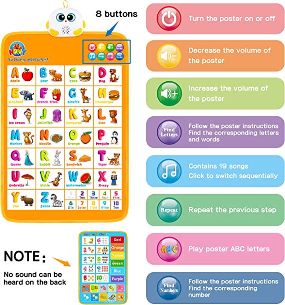 This colorful alphabet wall chart allows toddlers to learn letters A-Z, numbers 1-10, and 102 words, which helps to develop their memory, hearing, and sensory ability. And the learning poster has 10 popular kid songs which can grab your child’s attention. This educational chart is a great choice for toddlers learning to speak and curious about everything.