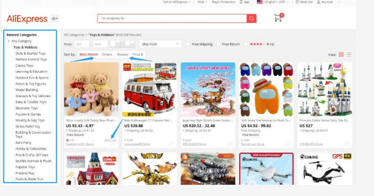 Similar to DHgate.com, AliExpress.com has a more detailed breakdown of the toy category. At the same time, it prioritizes product display and assigns a small amount of information about the seller on the product page.