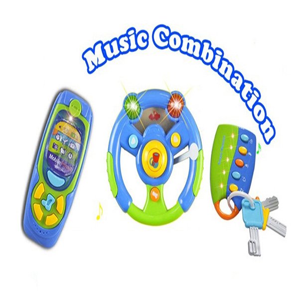 This trending bespoke 3-In-1 traffic combination music toys set includes steering wheel, slender mobile phone, cartoon car key.