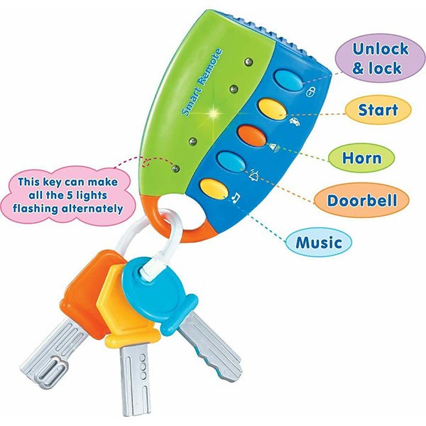 The impressive remote control has three keys as well as five different buttons. What sound will surprise your baby this time?