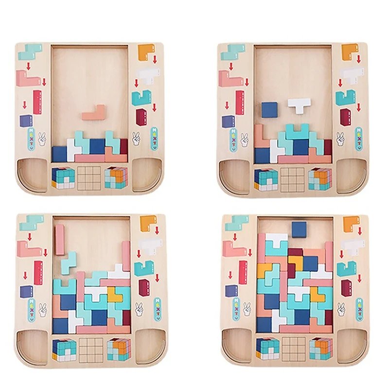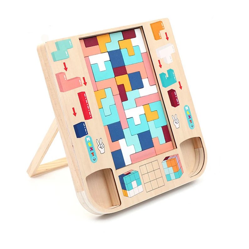 Our wooden block puzzle adopts geometric patterns & bright colors, keeps children & parents busy for different options to play. Parents drop blocks randomly from top opening, kids make puzzles with blocks they get from corner. Ergonomic back support design, care for kid’s growth. Just like tetris without screen & time limit!