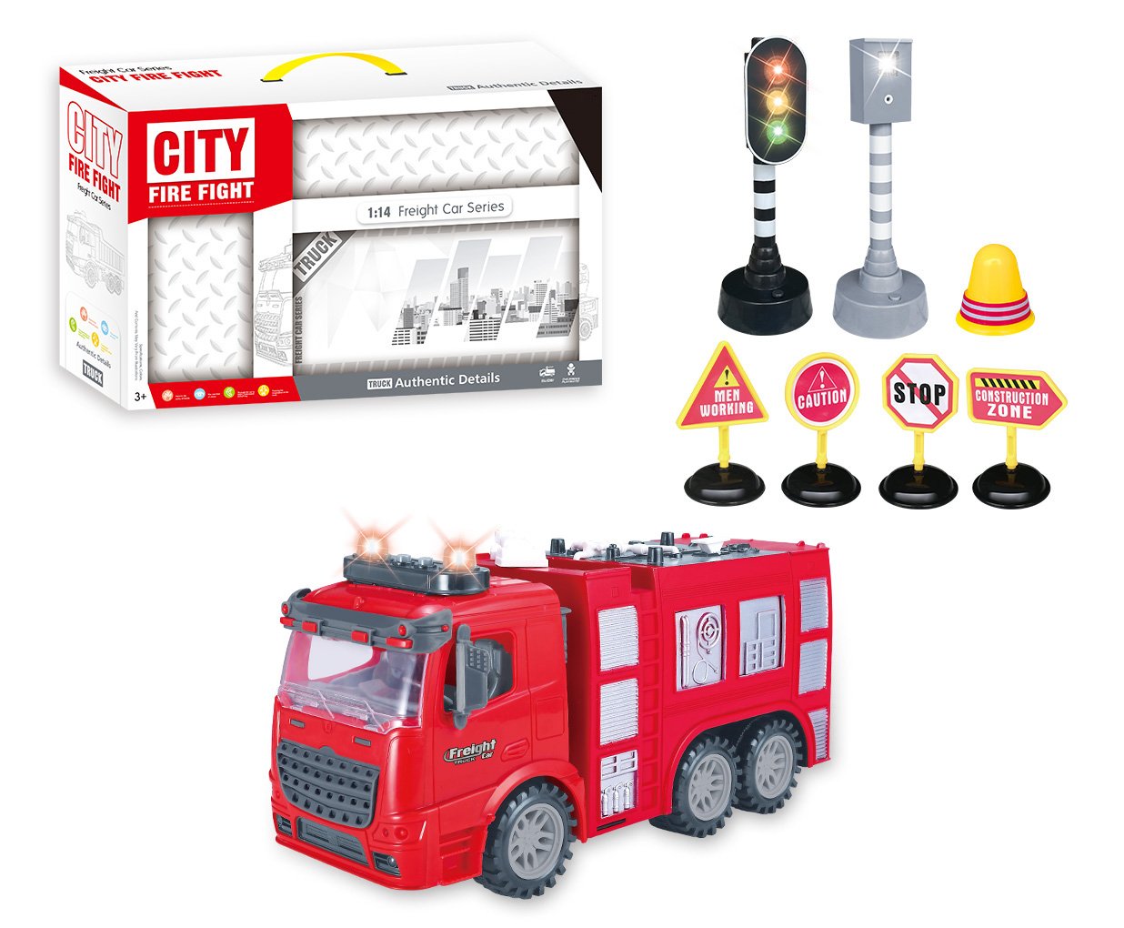 Type: Bulk Inertia Fire Engine with Light & Music, Included 7pcs different Road signs
