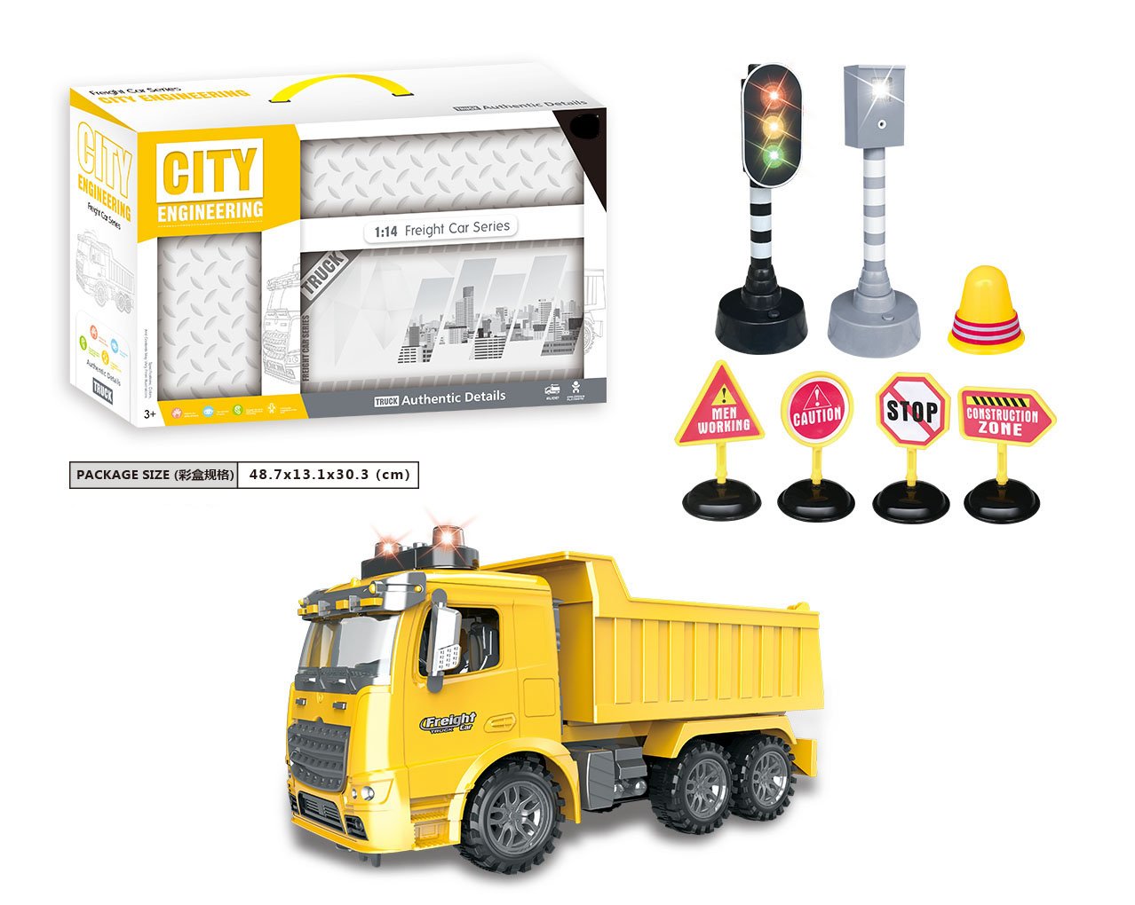 1:14 Freight Inertial Car with Light & Music, included 7pcs different Road signs: Traffic lights, Cameras, etc. This is the inertial engineering vehicle series, with music and lights and road signs, simulation of the real situation, let the children enjoy the process of play.