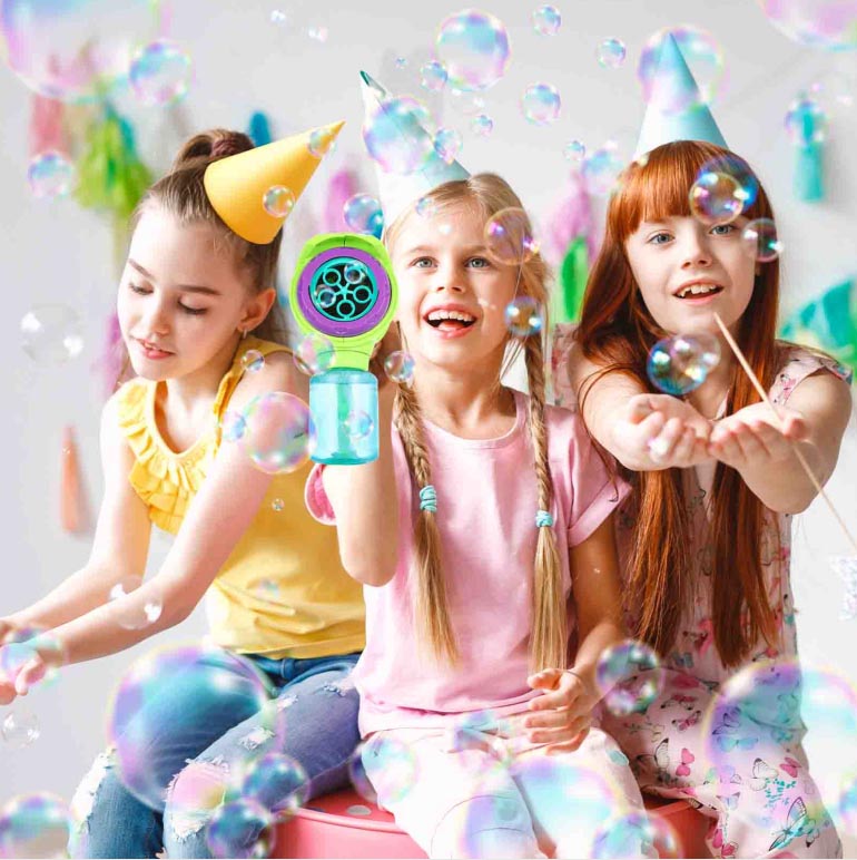 The Customized Bubble Toys has 5 bubble holes, blowing thousands of colorful bubbles every minute. No more need to blow the bubbles tiredly. Realistic design and bright colors are the toy bubble blowing machines you need. Rich and colorful bubbles can make your party more lively and exciting, can make the children’s world more happy and interesting!