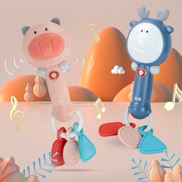 1. The customized deer shape shaking rattle comes with lighting, 6 sound effects, 4 happy songs, 3 nursery rhymes, 36 Chinese and English words, 15 soothing sleep songs…small music stick, powerful memory function;