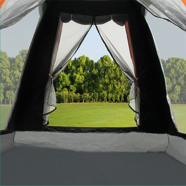 The straight wall design and interior space is larger and more comfortable. If the door curtain supports by two poles, it becomes a sunshade canopy. The top of the tent is high density mesh, which is very breathable. We can enjoy the beautiful scenery of the sky when lying inside.