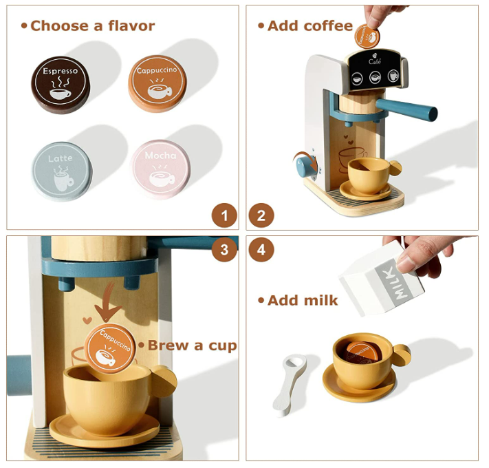 Great OEM Wooden Toys Coffee Maker for kids 3+ Brew a perfect cup: A realistic looking wooden coffee maker toy, Pick a flavor, Espresso Cappuccino Mocha or Latter? Put your wood toys coffee pods on the top, dial the knob on the side to make click-click sound , then turn the filter to brew the coffee in the colorful coffee cup.