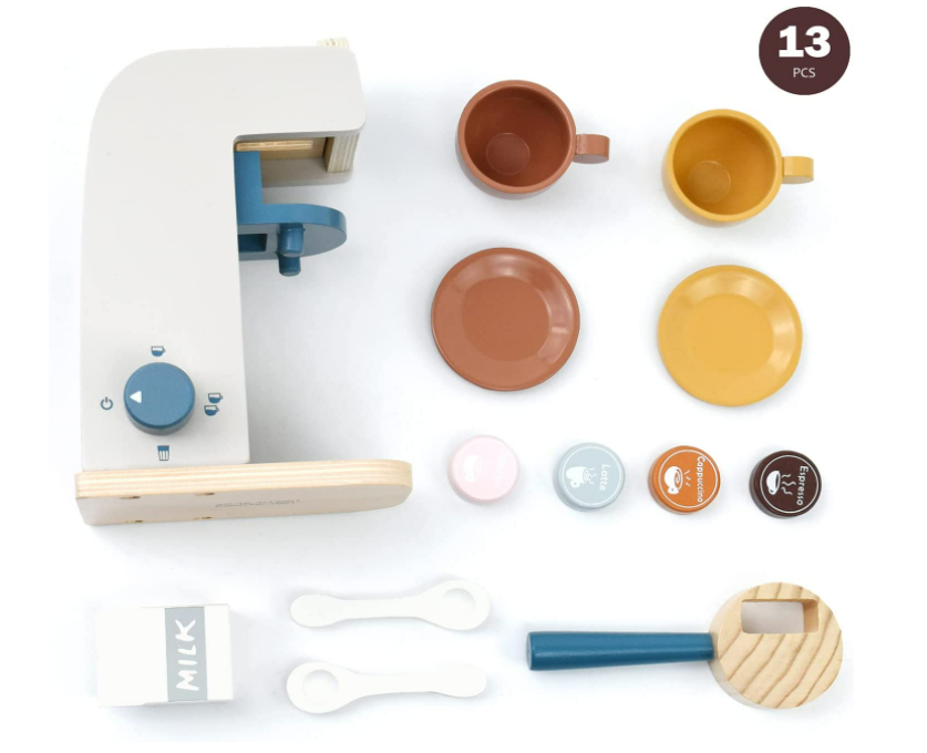 Great OEM Wooden Toys Coffee Maker for kids 3+ has Super cute wooden play kitchen accessories: 13 pieces in all! This kids wooden toys including 1 Coffee machine 1 Filter 2 Cups 2 Saucer 2 Spoons 1 Milk 4 Coffee pods.