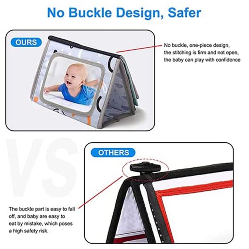Soft baby activity book, high contrast book colours, huge baby safety mirror and face drawing allow babies to focus on one image and minimise irritation.