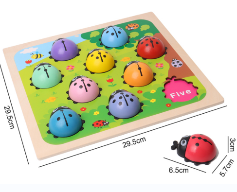 There are two ways to play this oem wooden puzzle. The first is digital pairing. Each ladybug has a corresponding number dot on its back and a corresponding number on the puzzle board. The second is color pairing, where the color of each ladybug corresponds to the color on the puzzle. Both play styles help children better recognize numbers and colors.