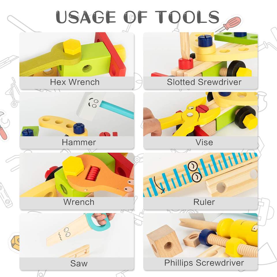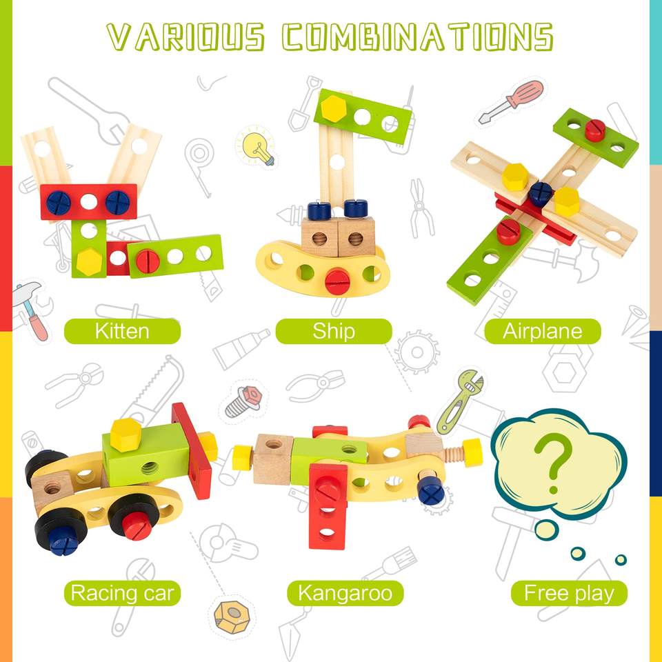 This kind of oem wooden tool kit is great for kids’ color recognition, shape recognition, counting skills, fine motor skills and intelligence.
