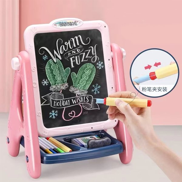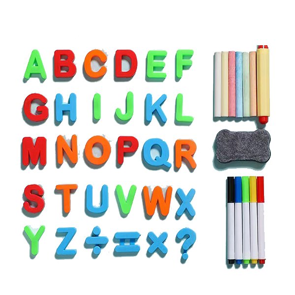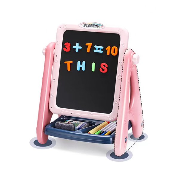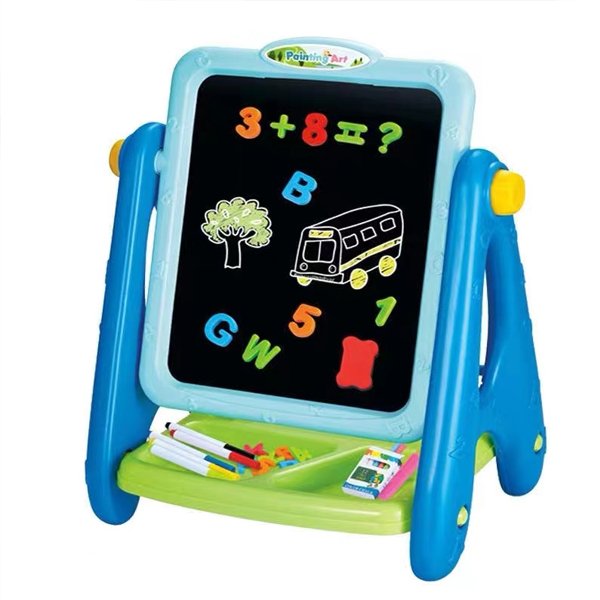 This painting art board for kids 2-4 bears two sides, a chalkboard, and a magnetic dry erase board for kids on the other side. This 4-in-1 chalk board for Kids comes with magnetic numbers and letters, chalk, coloring markers, an eraser for the dry erase board and chalkboard.