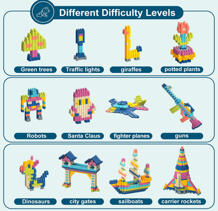 can be easily combined into any shape. Such as flowers, animals, castles, planes, rockets, tanks, buildings, robots, etc. Let your child’s imagination run wild! Helps develop your child’s spatial relationships, 3D spatial imagination and hand-eye coordination.