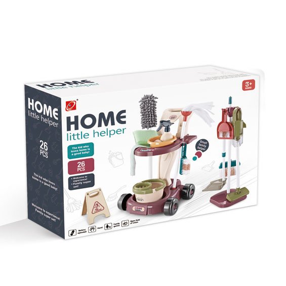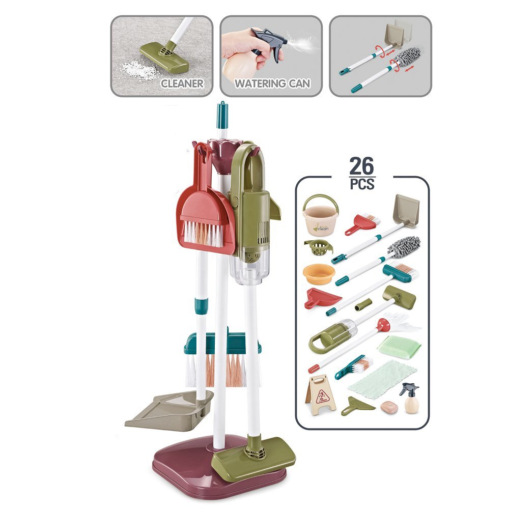 The kids’ play cleaning set & housekeeping accessories are detachable & easy to assemble. It comes with soap, rag, brush, dish sponge, basin, cleaning spatula, dustpan, spray bottle, mop, sticker, broom and cleaning duster.