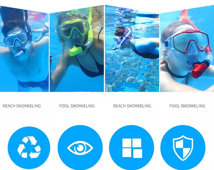 The skirts of the Wholesale Kids Snorkel Set and its mouthpiece are made of food-grade silicone without an odorous smell. This child snorkel gear will not make the kid’s face allergic, uncomfortable or painful. It is durable and easy to clean and especially suitable for long-term usage.