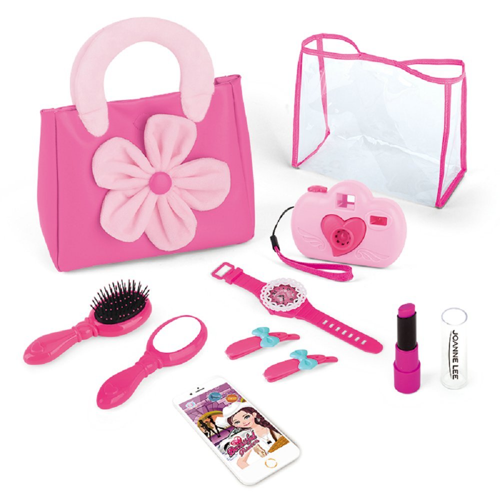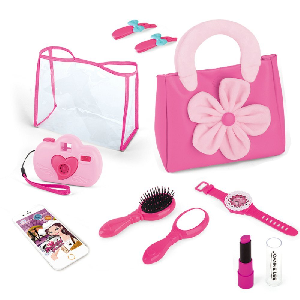 A cute pink play purse that features 1 carrying handles bag, and 1 ransparent bag which makes it easy to carry the smartphone, car keys, credit card, hair brush, lipstick, and blush with applicator.