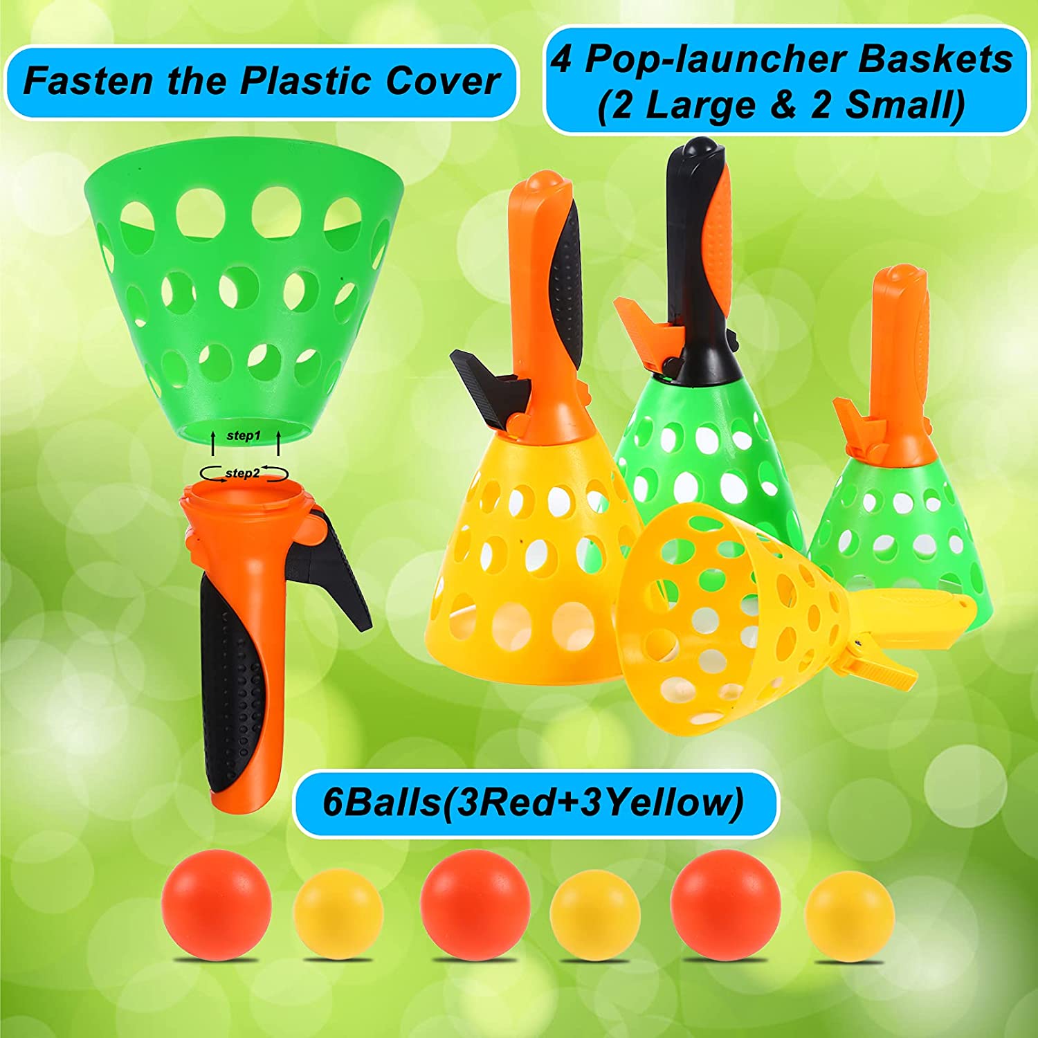 All our pop and catch launchers, along with the 4 lightweight handheld pop-launcher baskets, 4 launchers and 6 playing balls. Just easy to start throwing and catching ball races !