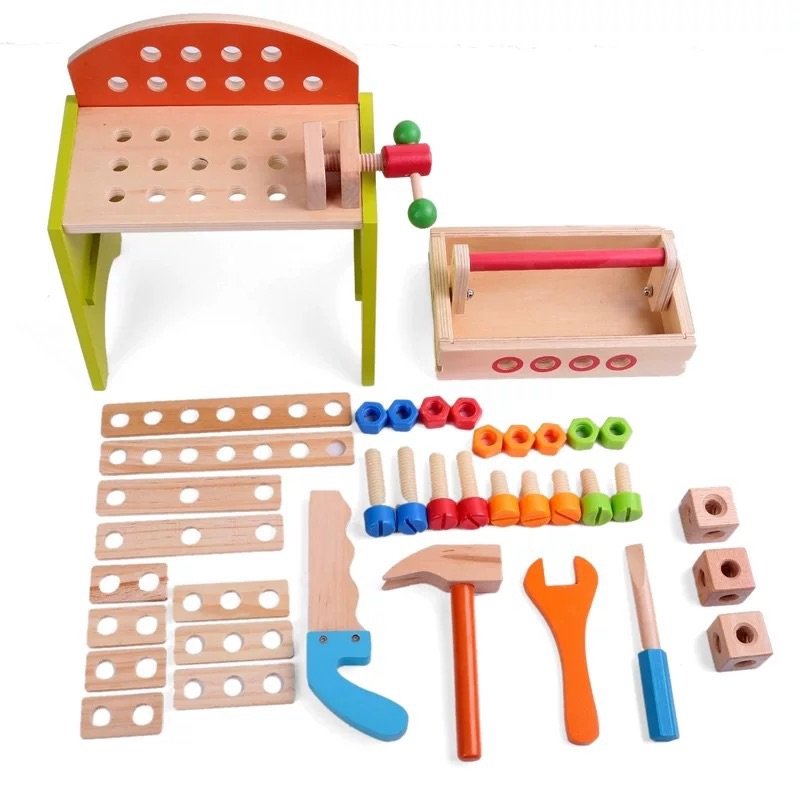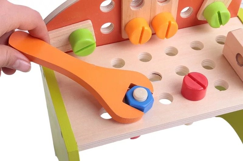 Wholesale wooden workbench toys including a hammer, saw, screwdriver, wrench, vise,, screws, nuts, bolts, gears, links and more creative parts for building. Kids can work on together for hours,This is a fun process that develops your little one’s motor skills and hand-eye coordination.