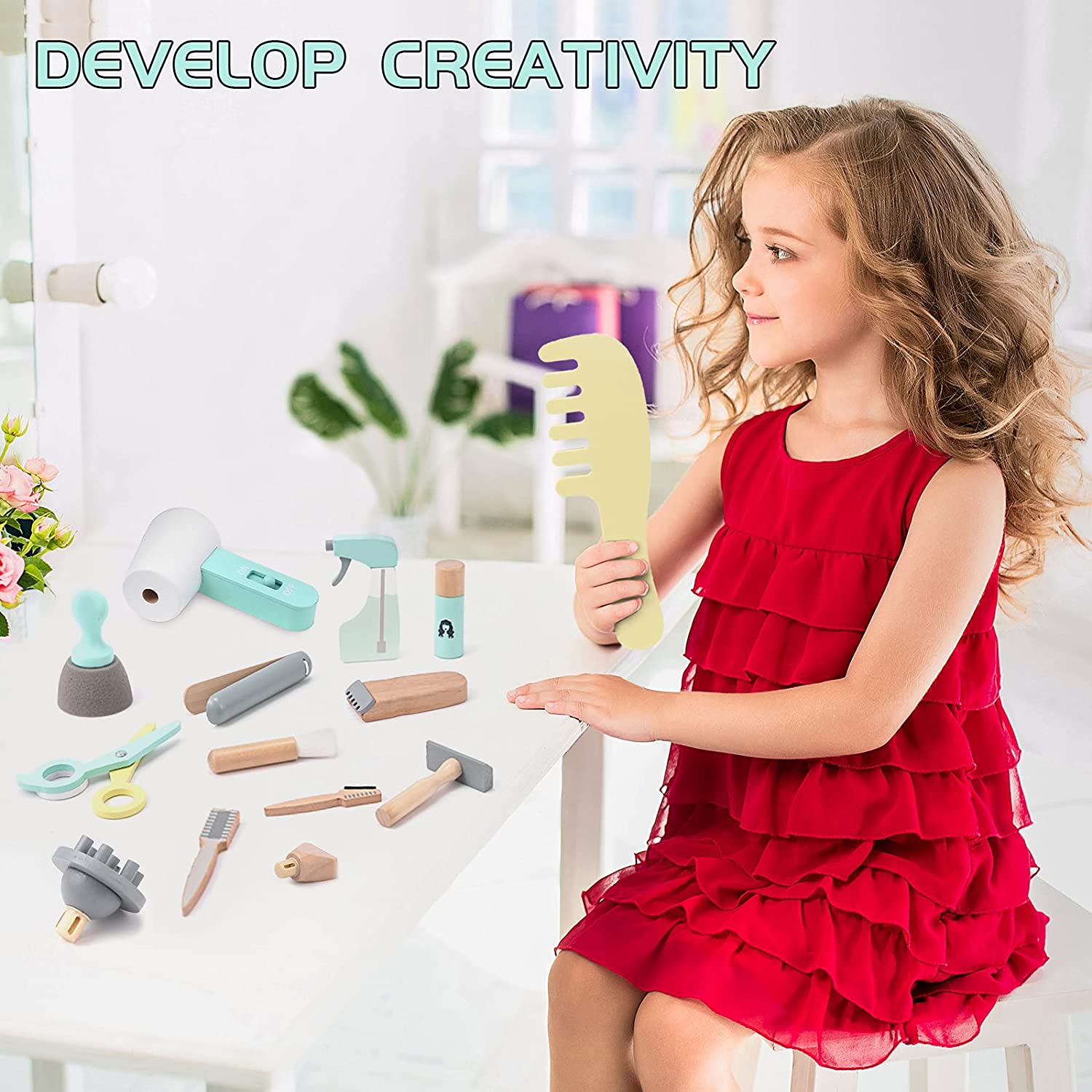 18 pieces of realistic wooden hair stylist set including hairdryer, hairdressing watering can, hair clipper, beard foam, etc. The set contains all the tools and accessories needed for playing in the hair salon. Children can completely immerse themselves in the dressing-up game and truly play themselves as a little barber, which helps stimulate imagination and hands-on ability.