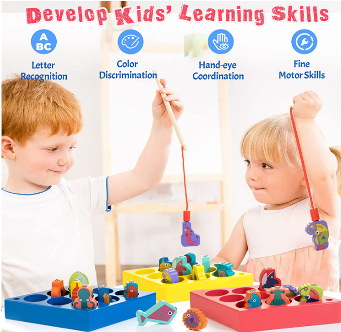 3 in 1 Fishing Game: Wooden Magnetic Fishing Game Combines magnetic fishing game and alphabet learning into one. Comes with 3 fishing boards, 3 fishing rods and 27 magnetic blocks, each letter block corresponds to a different fish pattern. Allows kids to play alone or play in groups, roll the dice to decide who takes the first step, compete to catch the most fish. Guess who is winner?